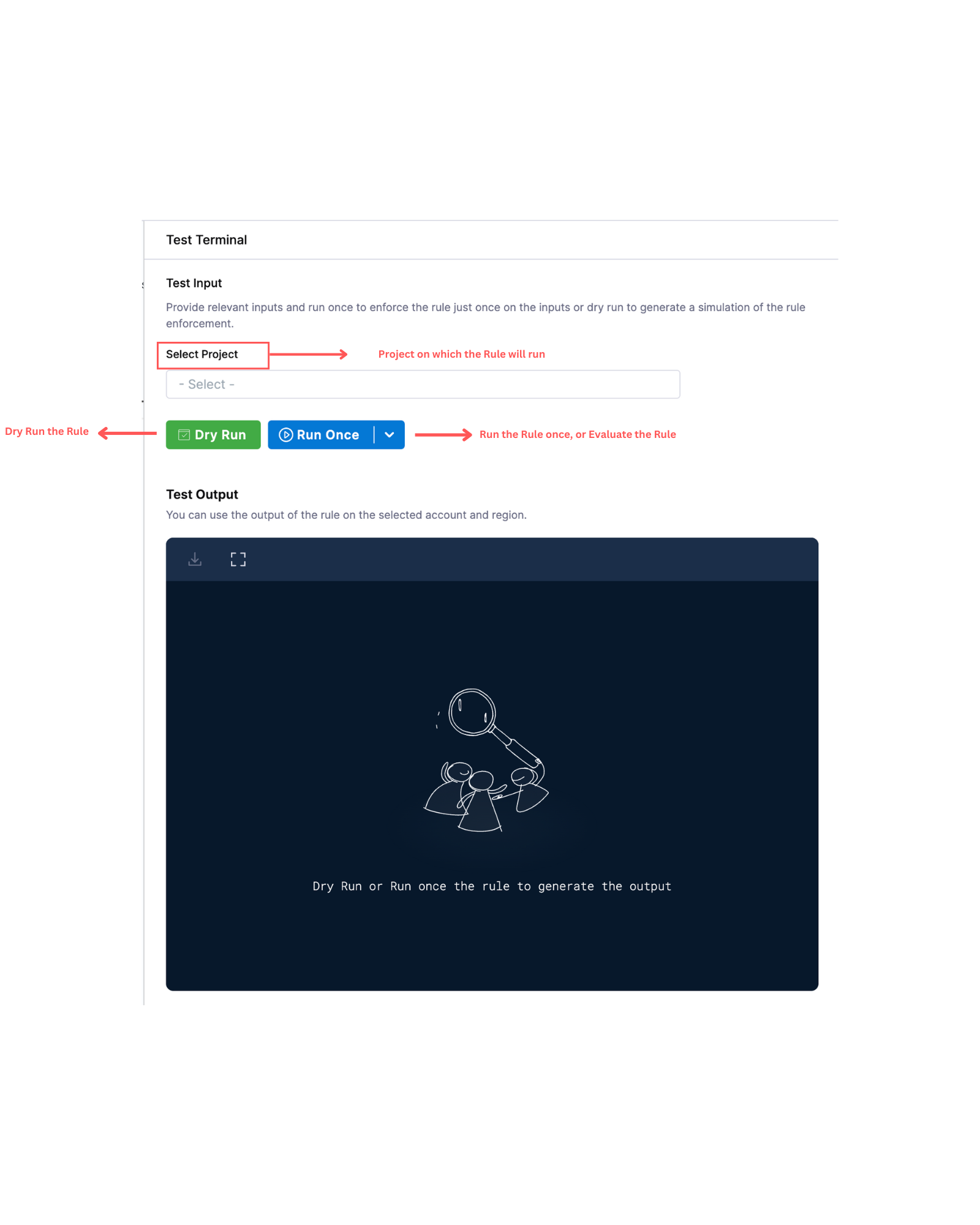 In the rule editor, a test terminal is present for users to see the output in the terminal itself upon evaluating a Rule. This is done to ensure that users can run the rules and try accordingly to check how the output would look on the selected project. After providing the relevant input, the users can select either to dry run the rule first, run it once or enforce the rule.