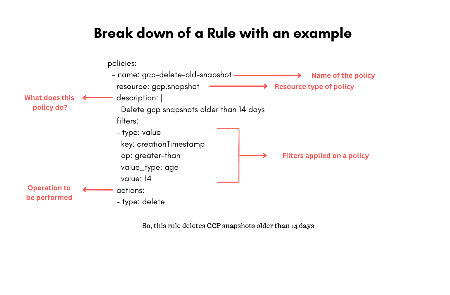 So essentially, a Rule is a file that includes logic defined by a policy that performs certain actions on the resource based on the filters provided by the user. Rules can include multiple policies, and policies include resource, filters and actions.