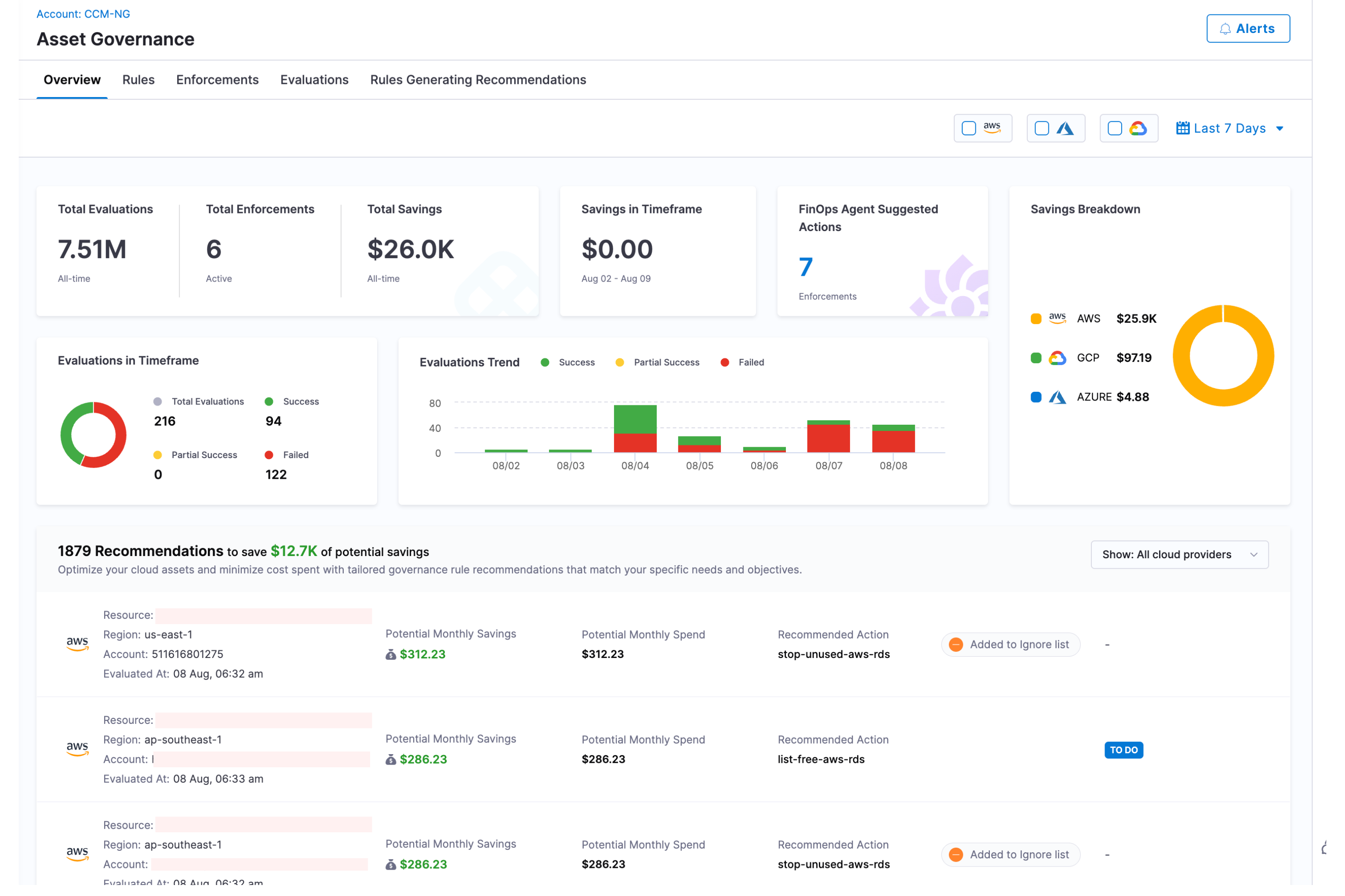 The Overview page offers a consolidated summary of your organization's governance active enforcements, evaluations and cost savings resulting from rule evaluations.This provides a quick and easy way to monitor your cloud spend and ensure compliance with your governance policies. Additionally, you can access valuable recommendations for optimizing resource utilization, allowing you to achieve even greater cost savings.