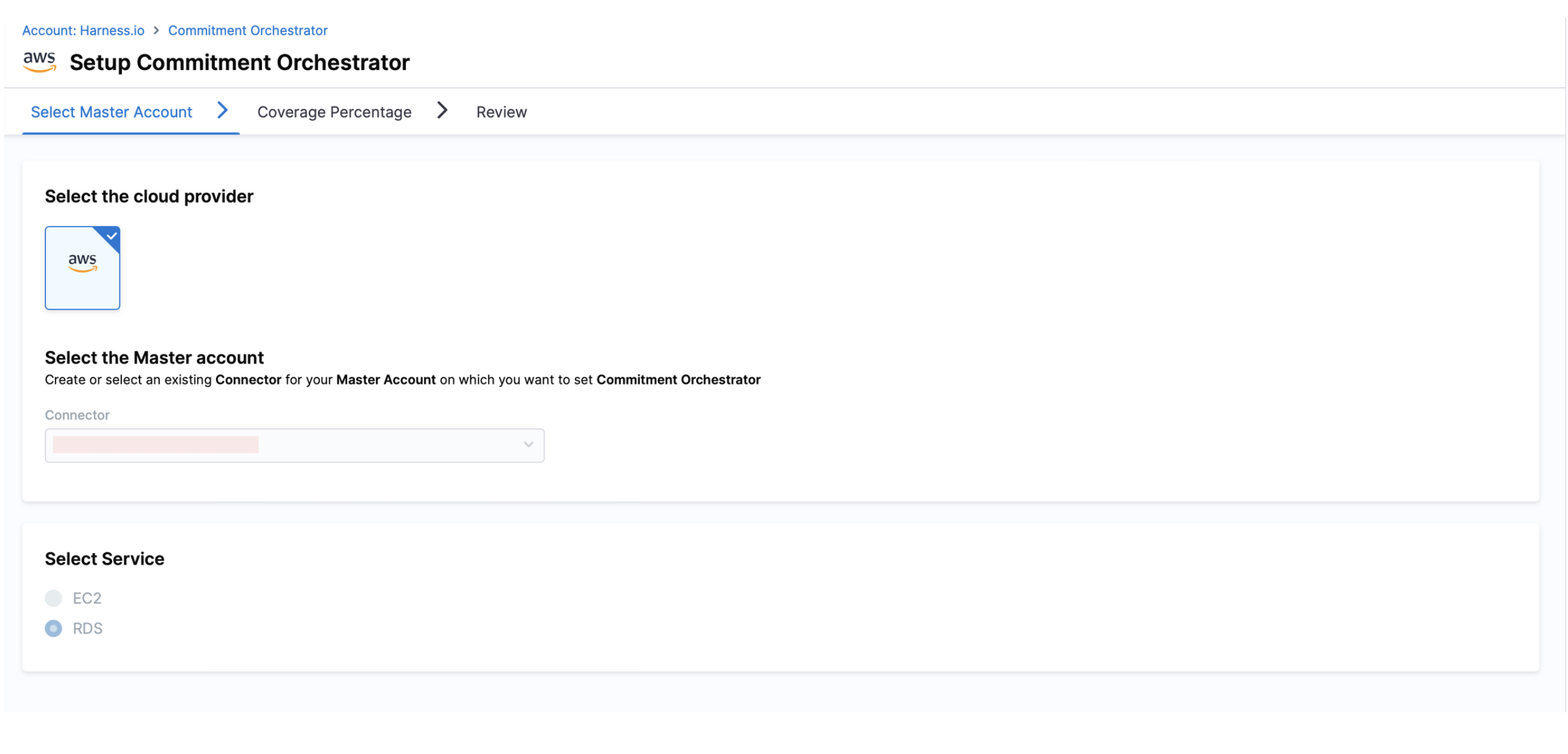 You can either select an existing connector for your master account or create one. Please note, even if "Commitment Orchestrator" is enabled in Connector Set Up for any other Account except for Master, it will not be visible in the connector list in Commitment Orchestrator Setup since Commitment Orchestrator requires Master Account connector.