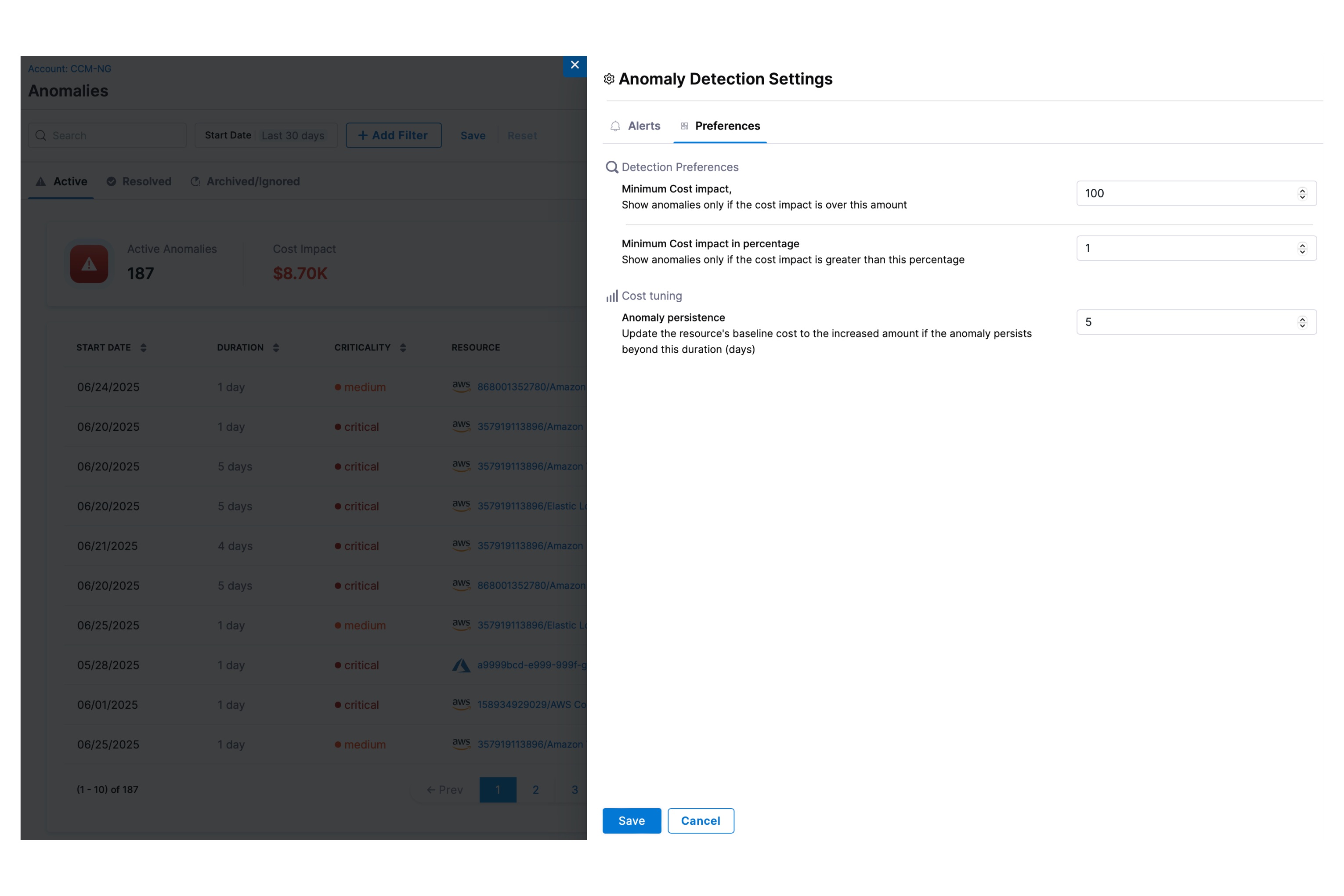 1. Minimum Cost Impact (Amount): This setting allows you to set a threshold for the cost impact in USD, meaning that anomalies will only be shown if the financial impact exceeds the specified amount.