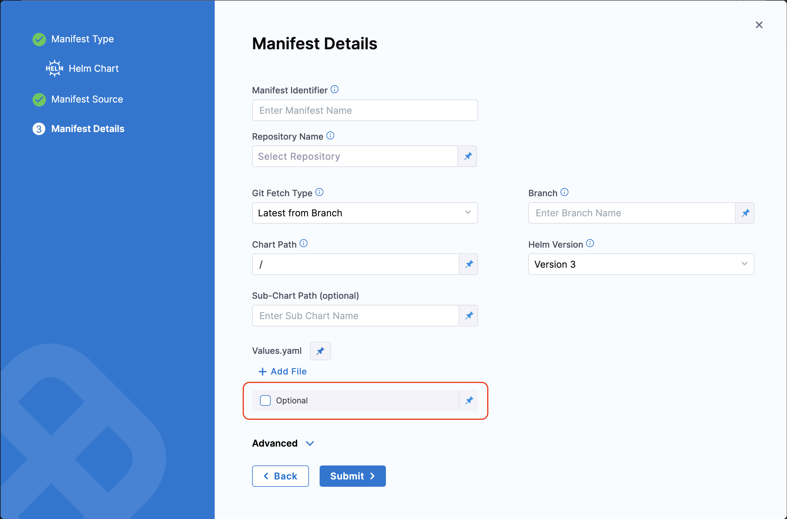 • If you want to pass in some command flags when Harness performs the --uninstall, enter uninstall in Manifest Details and enter in the relevant command flags.