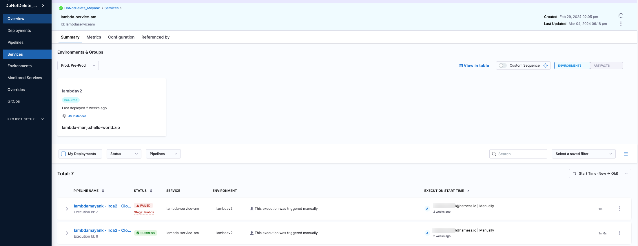 Clicking on any card in this dashboard filters the executions list to display executions relevant to the service and environment/artifact under the Summary tab.