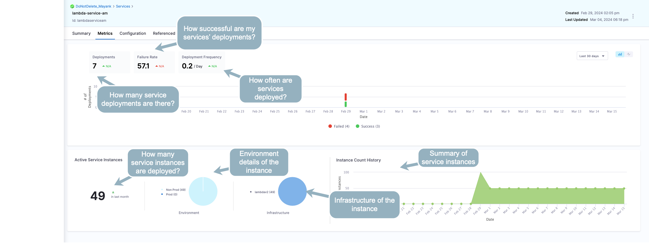 The Metrics tab under a particular service provides details of the service deployments, failure rate, deployment frequency, active service instances, the underlying environment and infrastructure for the service instance, and a summary of instances over a selected period.