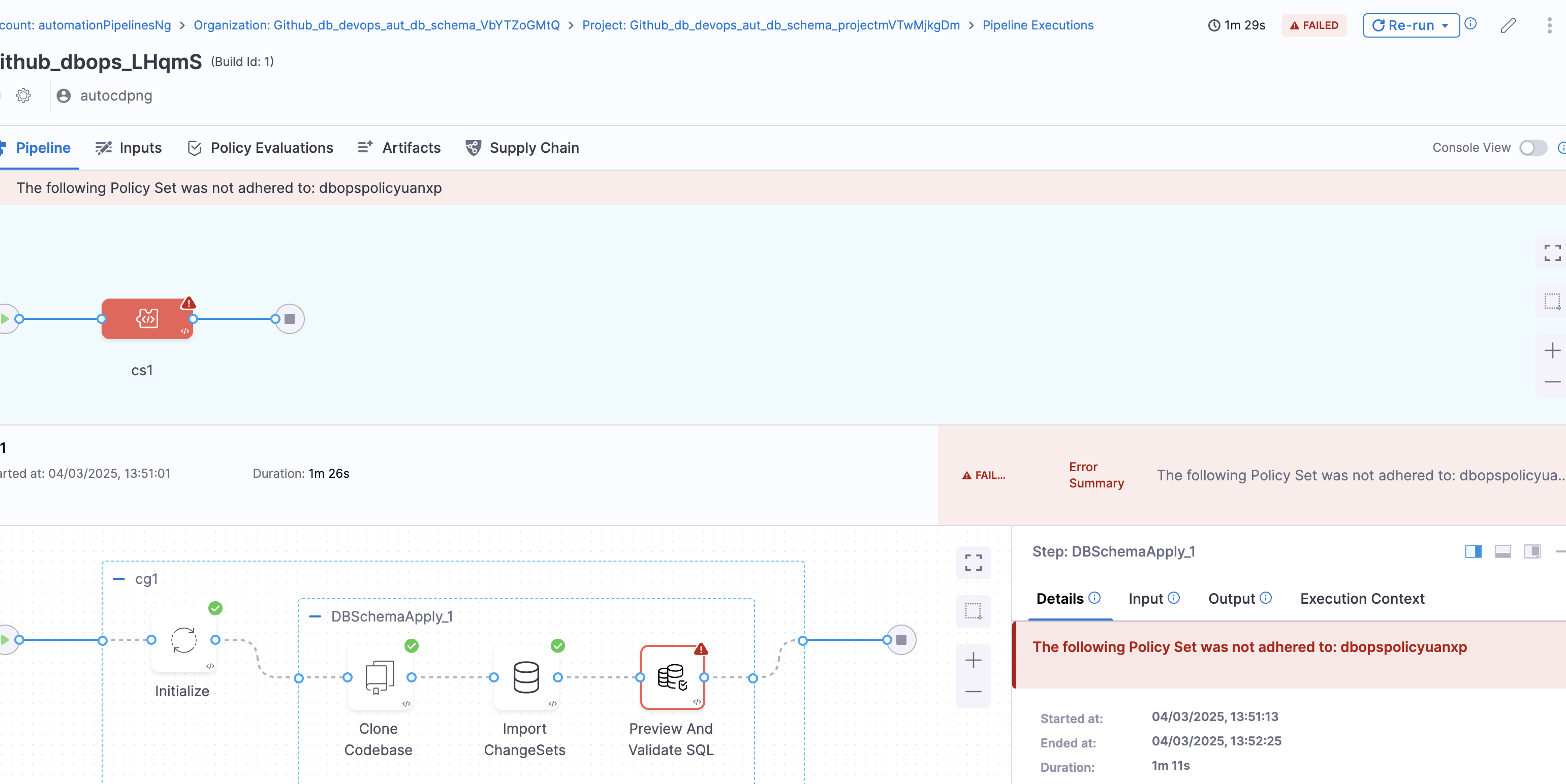If a violation occurs, OPA will output a message indicating the problem (e.g., "Dropping tables is not allowed: users") and result in error / warning as per configuration.