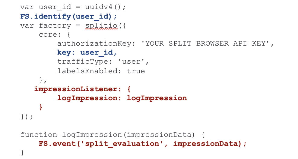 evaluations by calling FS.identify. In the listing above, the user_id is shared by the FS.identify API call and the FME SDK configuration key (shown in blue). -