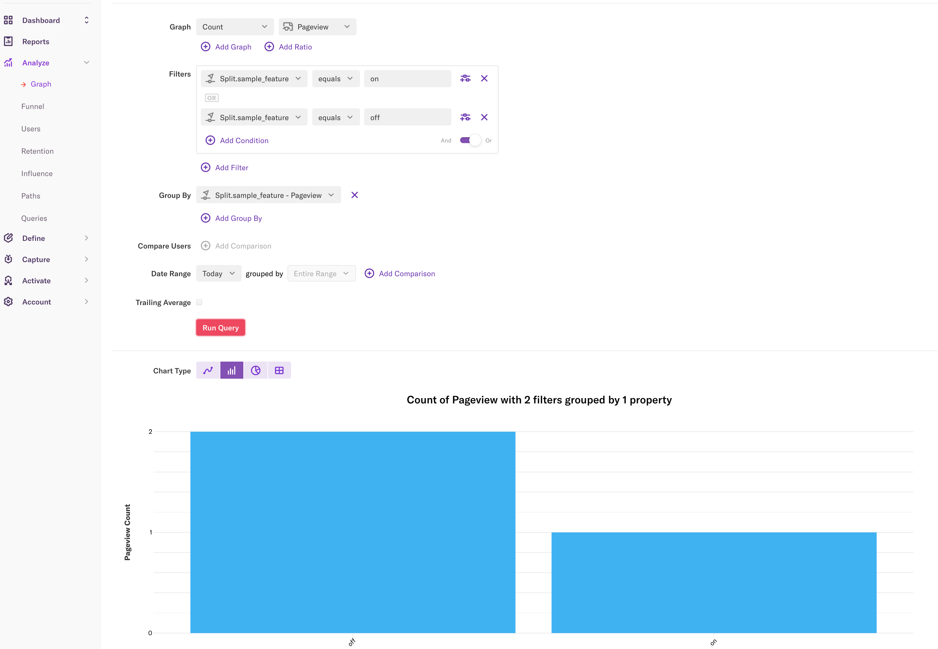 Create a graph of the count of page views filtering by Harness FME feature flag names and treatments. Group by the flag name to see the count by treatment.