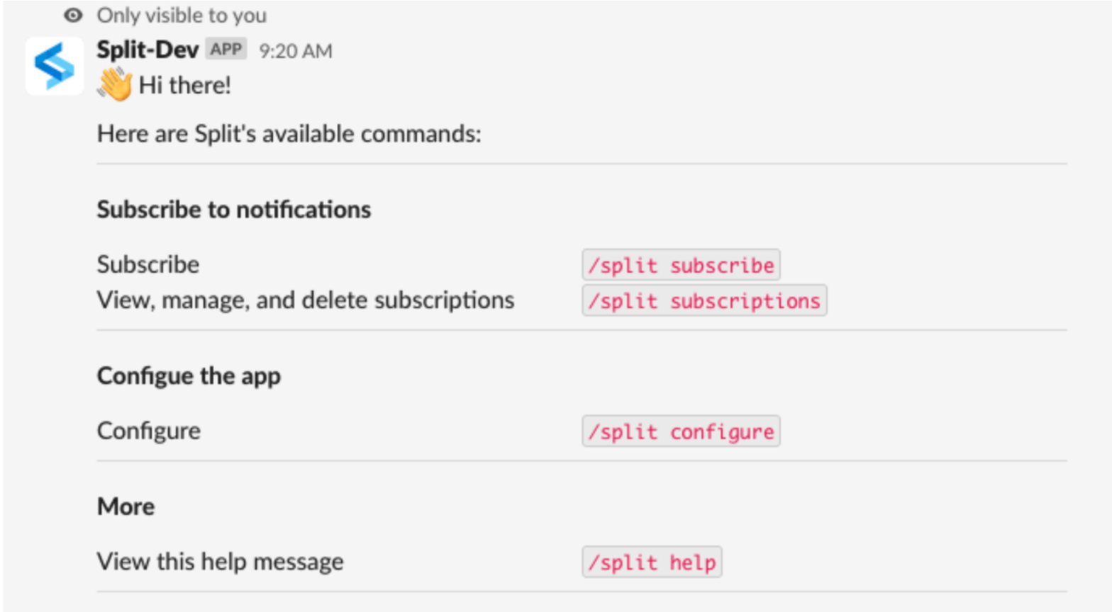 command to display the Configure Split app modal. When you enter your Harness authentication token and submit it here, this links the Slack app with your Harness account. Note that you only need to use this command if you didn’t previously click the Configure button in the welcome message.