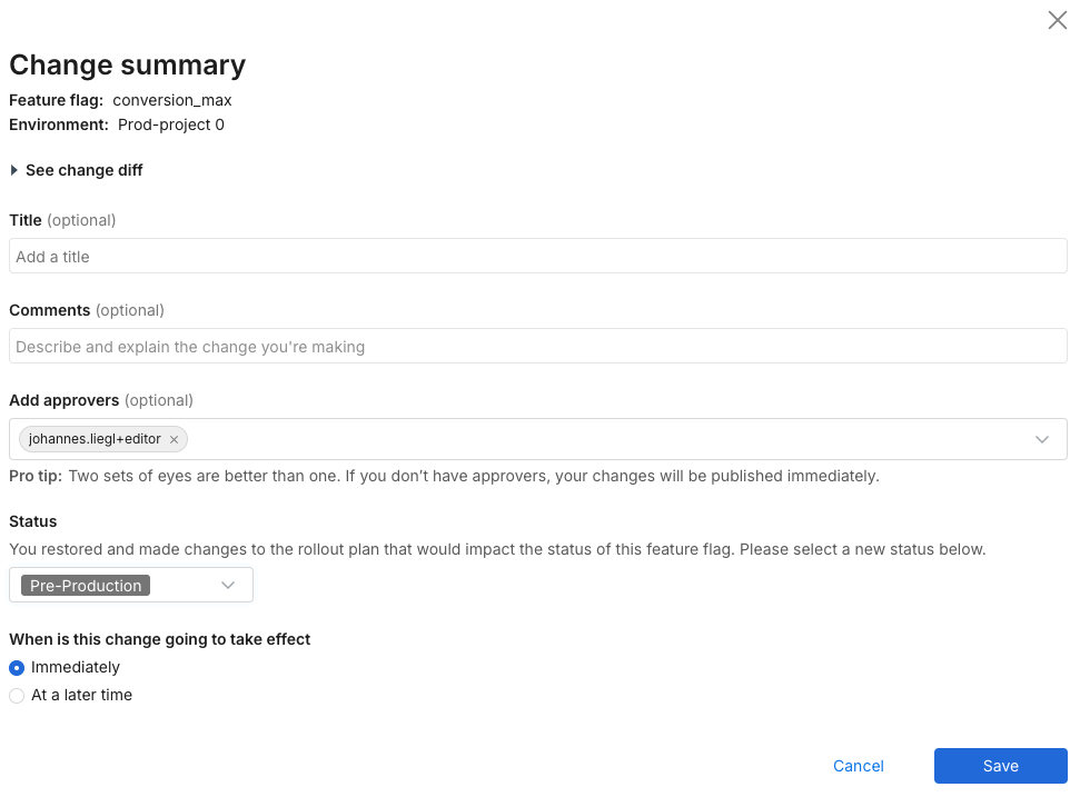 Additionally, you can also change permissions when you click the Review changes button on the Targeting rules page. This takes you to the Change summary page with the option to either click the Skip Approvals & Save link or go through the approval process similar to other users.