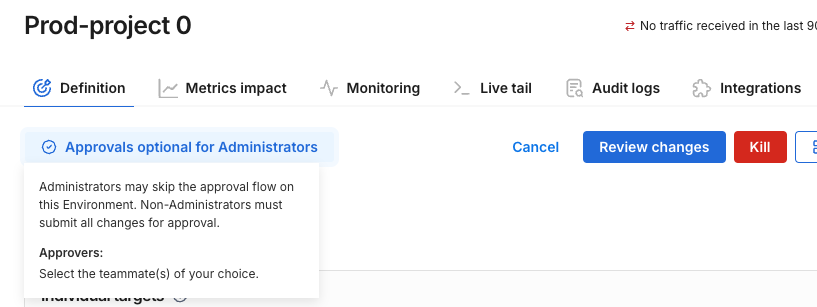 If the environment is set to Allow Admins to Skip the Approval, the following message appears on the feature flag that indicates that the admin now has the option to skip approvals. This message is only available for Admins. For other users, the message Approvals required appears.