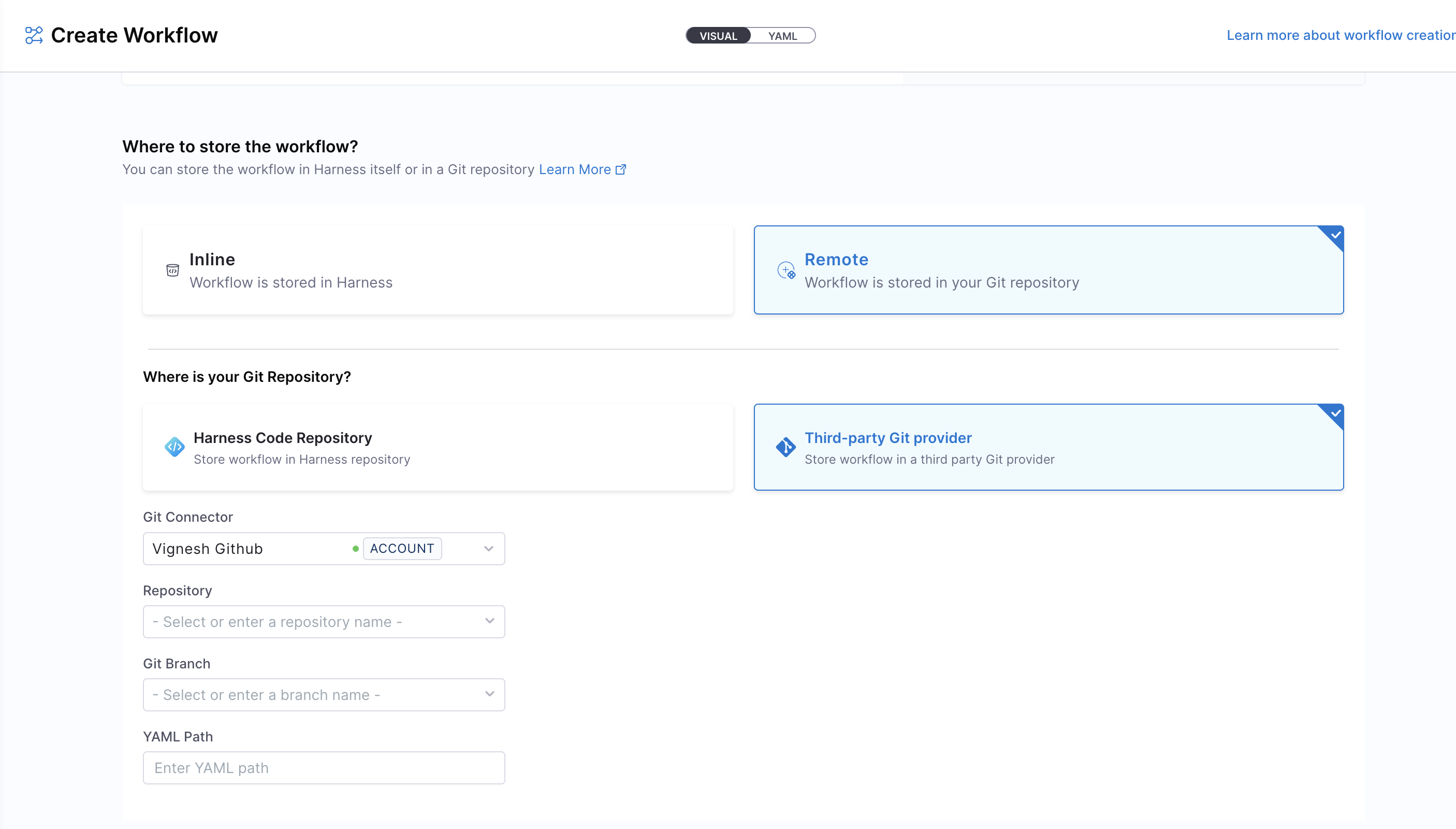 • Remote: Choose to store your Workflow YAML in a Git repository for version control, collaboration, and change tracking. You can either use a Harness Code Repository or connect to a Third-party Git provider like GitHub or GitLab by selecting a Git connector, repository, branch, and YAML path.