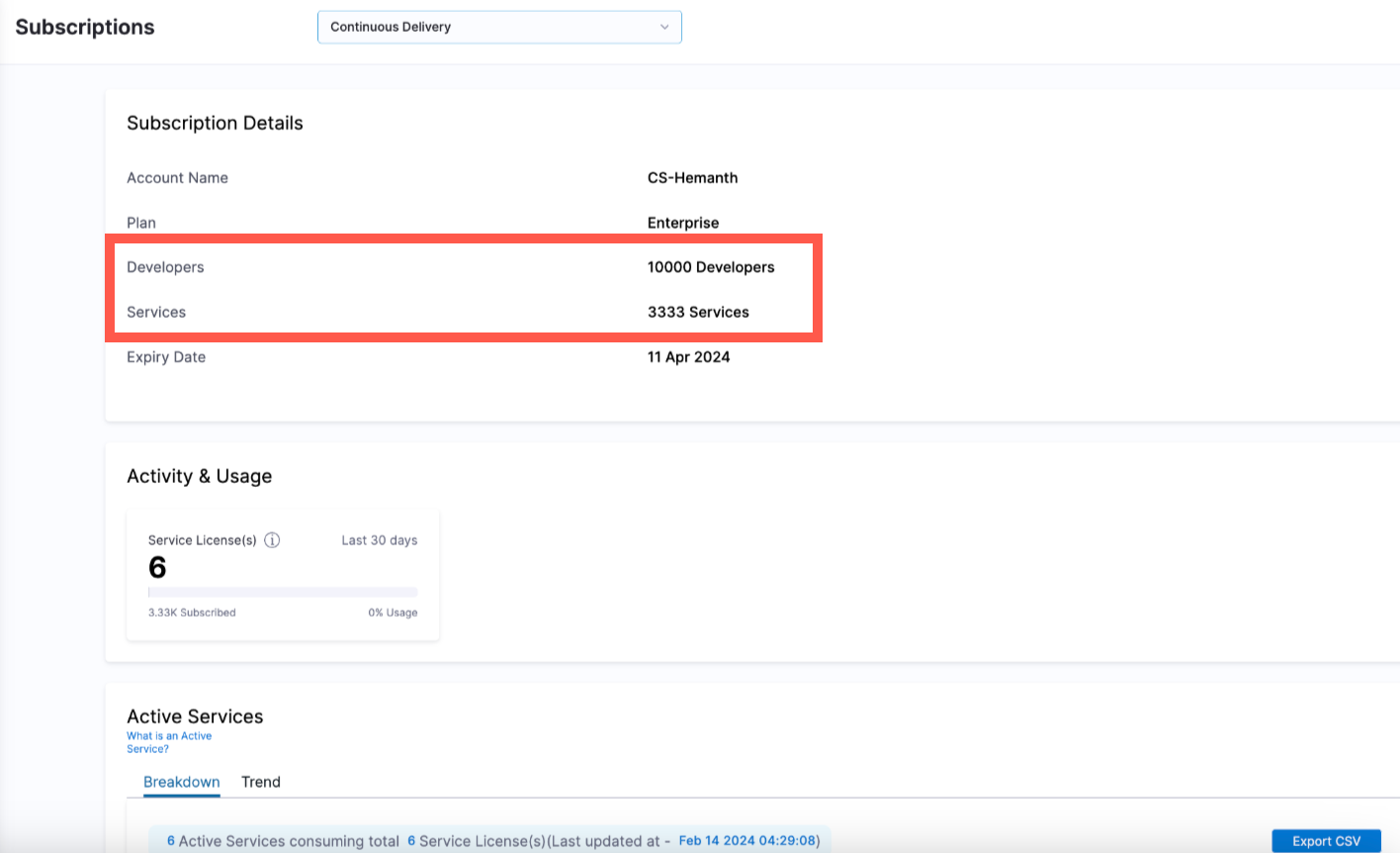 For Developer 360 module subscriptions, you can view your subscription details on the Subscriptions page. In your Harness account, go to Account Settings, then select Subscriptions.