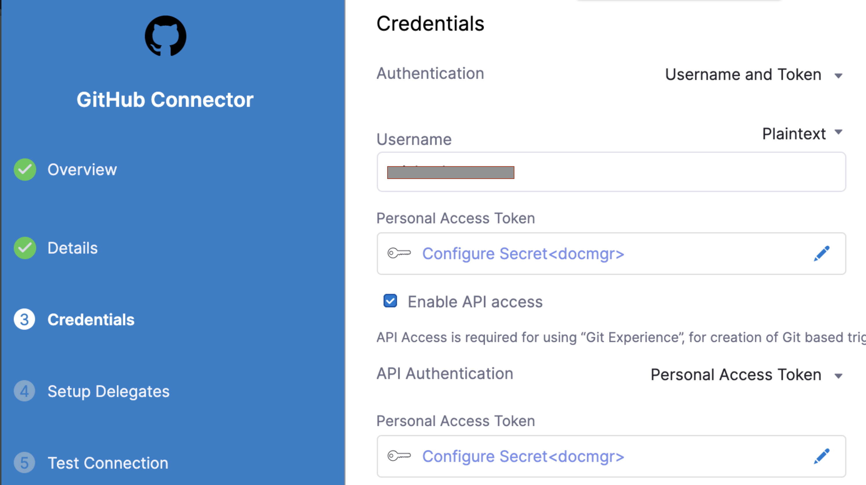 Connector must use the Enable API access option and Token The Connector must use the Enable API access option and Username and Token authentication. Harness requires the token for API access. Generate the token in your account on the Git provider and add it to Harness as a Secret. Next, use the token in the credentials for the Git Connector.