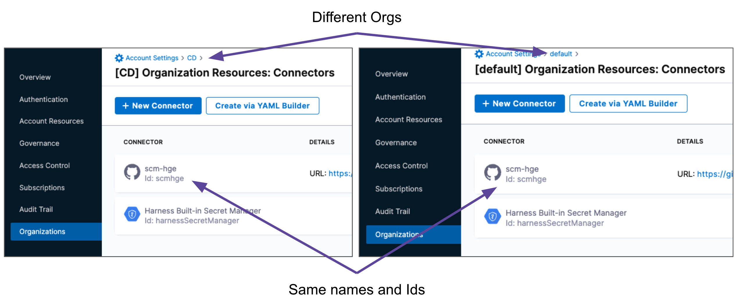 For information on Organizations and Projects, see Organizations and Projects Overview.For example, here are two GitHub Connectors with the same names and Ids but in different Harness Orgs: