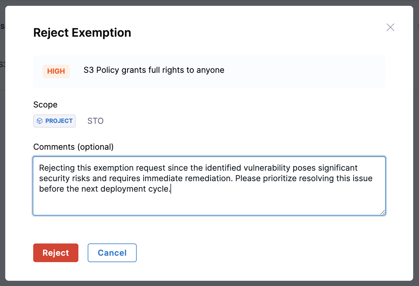 When you click on the Reject action, a window appears displaying details such as the Issue Title, Requested Scope, and an optional Comment field. You can review the request details, add a comment if needed, and click Submit to proceed.