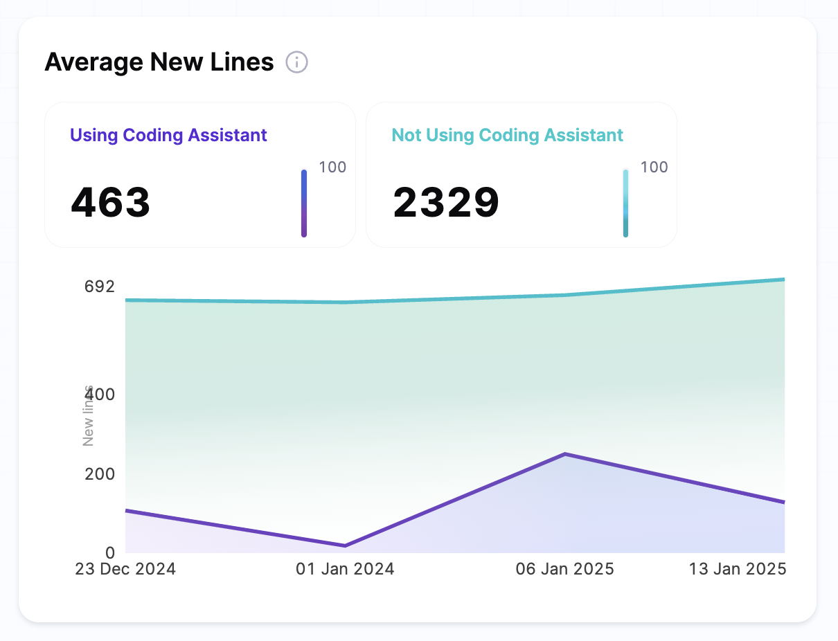 More new lines typically mean more development, but it’s important to understand whether using AI code assistants are adding quality code with fewer lines, or simply increasing code volume without improving the overall code quality.