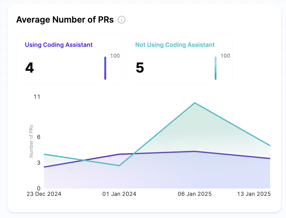 - If developers using AI code assistants have a higher average number of PRs per week, this suggests that AI-assisted coding helps improve developer efficiency.