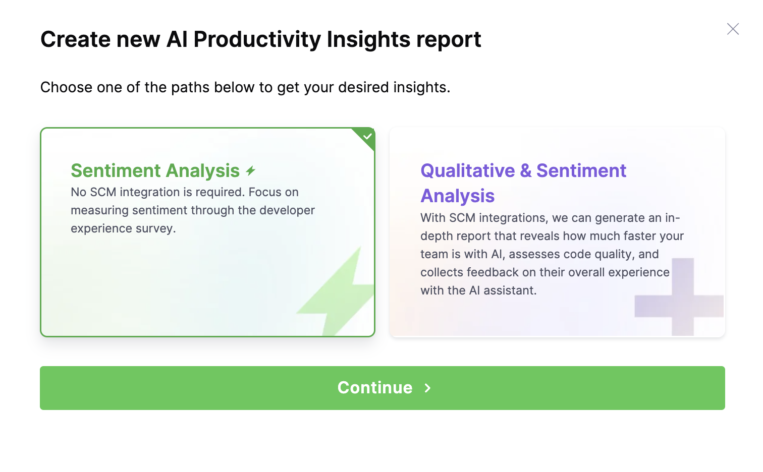 - Quick feedback loops: When you need to quickly assess how AI tools are impacting your developers' experience and performance.