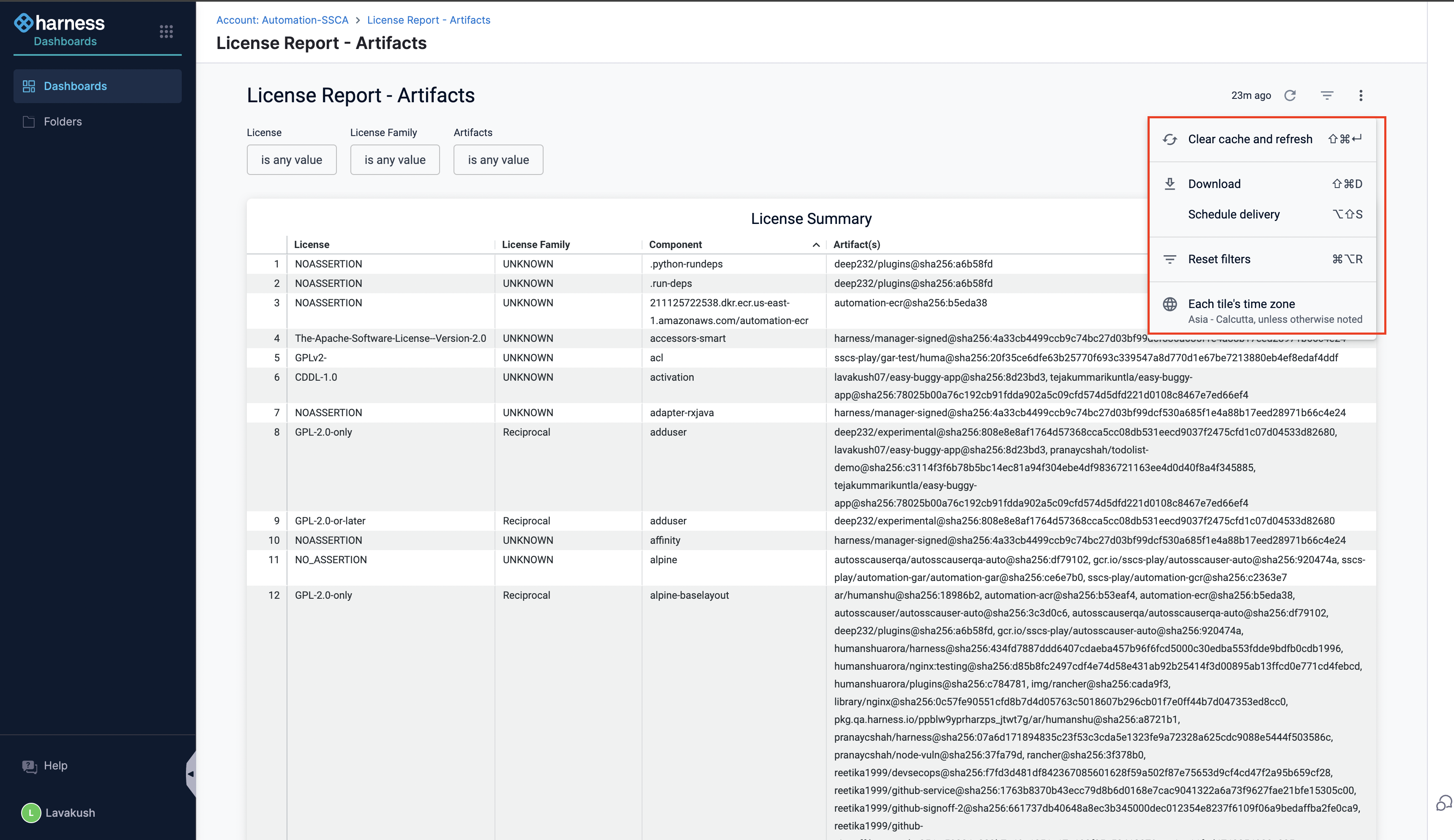 - Click on the License Report - Artifacts dashboard to view the license reports for artifacts. Similarly, you can view the license reports for code repositories by selecting License Report - Repositories.